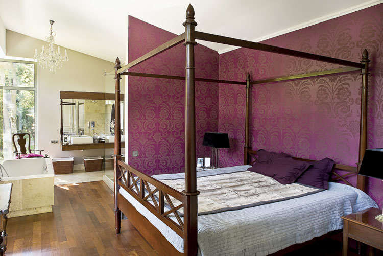• Na podłodze wapień, fornirowany blat pod umywalkami, drewniana podłoga i kosze nawiązują do stylu kolonialnego.