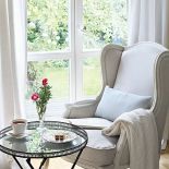 • Taras jest wyjątkowo urokliwy: wiklinowe fotele, porcelanowa zastawa na stole i widok na jabłonie.