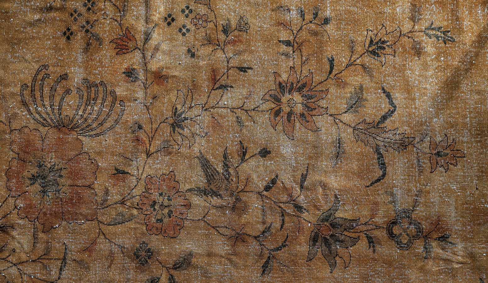 Postarzany dywan w kwiatowy wzór – SELVA Inspirowana barokiem romantyczna sypialnia Pavesi. Wzór na tkaninie obiciowej nawiązuje do kształtu diamentu ANGELO CAPPELLINI, angelocappellini.com