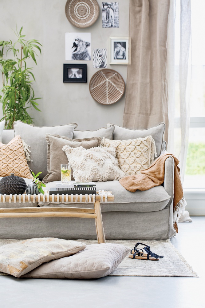 Salon w stylu boho: lniane obicia, wełniane pledy, miękkie poduszki to sposób na przytulny dom według duńskiej marki LENE BJERRE, lenebjerre.com
