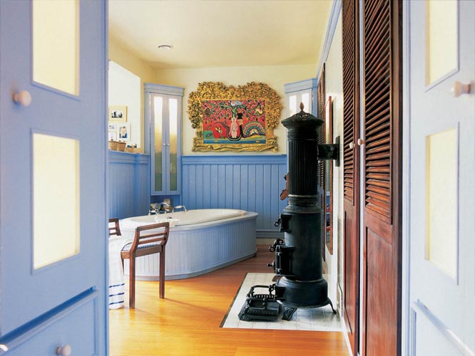 Życie rodzinne w tym domu zaczyna się każdego dnia w łazience. Dlatego właściciele uznali, że musi być duża, wygodna i wprawiać w dobry humor. Stąd pomysł na „błękitny salonik”.   Ta łazienka oswaja poranny pośpiech - bez problemu może tu szykować się do wyjścia cała rodzina i nikt na nikogo nie wpada, nikt nikogo nie musi poganiać. Jasnoniebieskie panele w wiktoriańskim stylu, szafki z ciemnego drewna i&