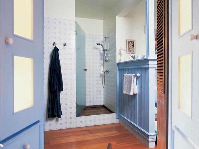 Życie rodzinne w tym domu zaczyna się każdego dnia w łazience. Dlatego właściciele uznali, że musi być duża, wygodna i wprawiać w dobry humor. Stąd pomysł na „błękitny salonik”.   Ta łazienka oswaja poranny pośpiech - bez problemu może tu szykować się do wyjścia cała rodzina i nikt na nikogo nie wpada, nikt nikogo nie musi poganiać. Jasnoniebieskie panele w wiktoriańskim stylu, szafki z ciemnego drewna i&