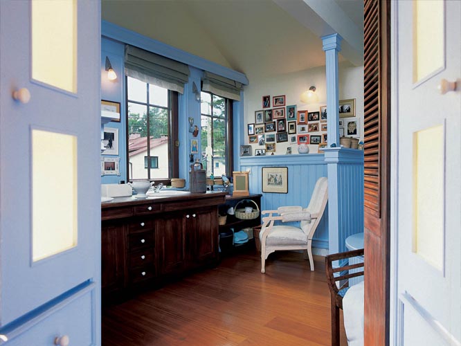 Życie rodzinne w tym domu zaczyna się każdego dnia w łazience. Dlatego właściciele uznali, że musi być duża, wygodna i wprawiać w dobry humor. Stąd pomysł na „błękitny salonik”.