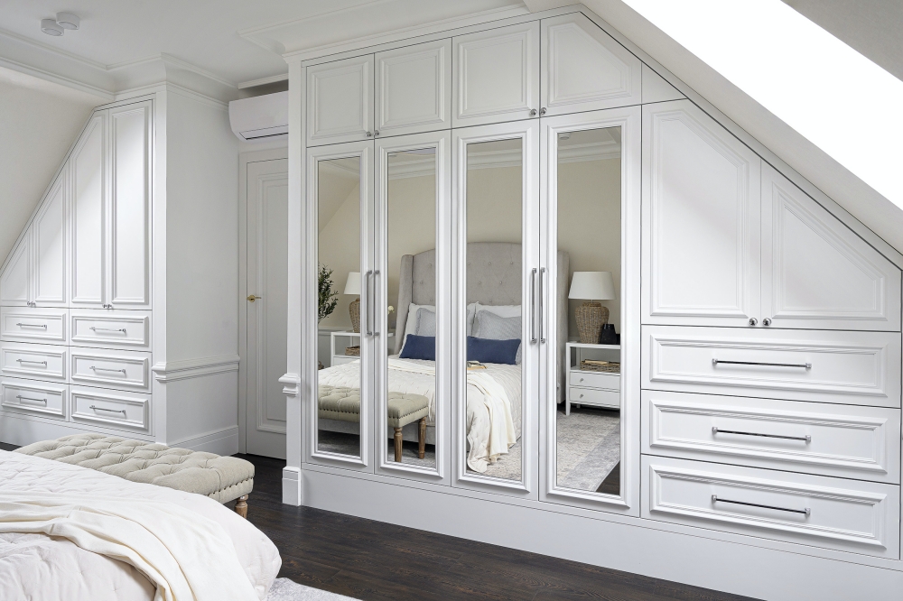 Na poddaszu sypialnię z małym oknem rozświetliły jasne kolory – biele i odcienie wanilii – oraz lustrzane fronty szafy, które odbijają światło.