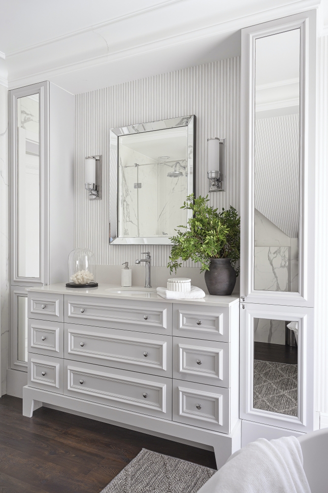 Oto wspomnienie eleganckich amerykańskich wnętrz podpatrzonych w filmach: sztukaterie, lamperie, jasne meble. Z odrobiną stylu hamptons, żeby było przytulnie i domowo.