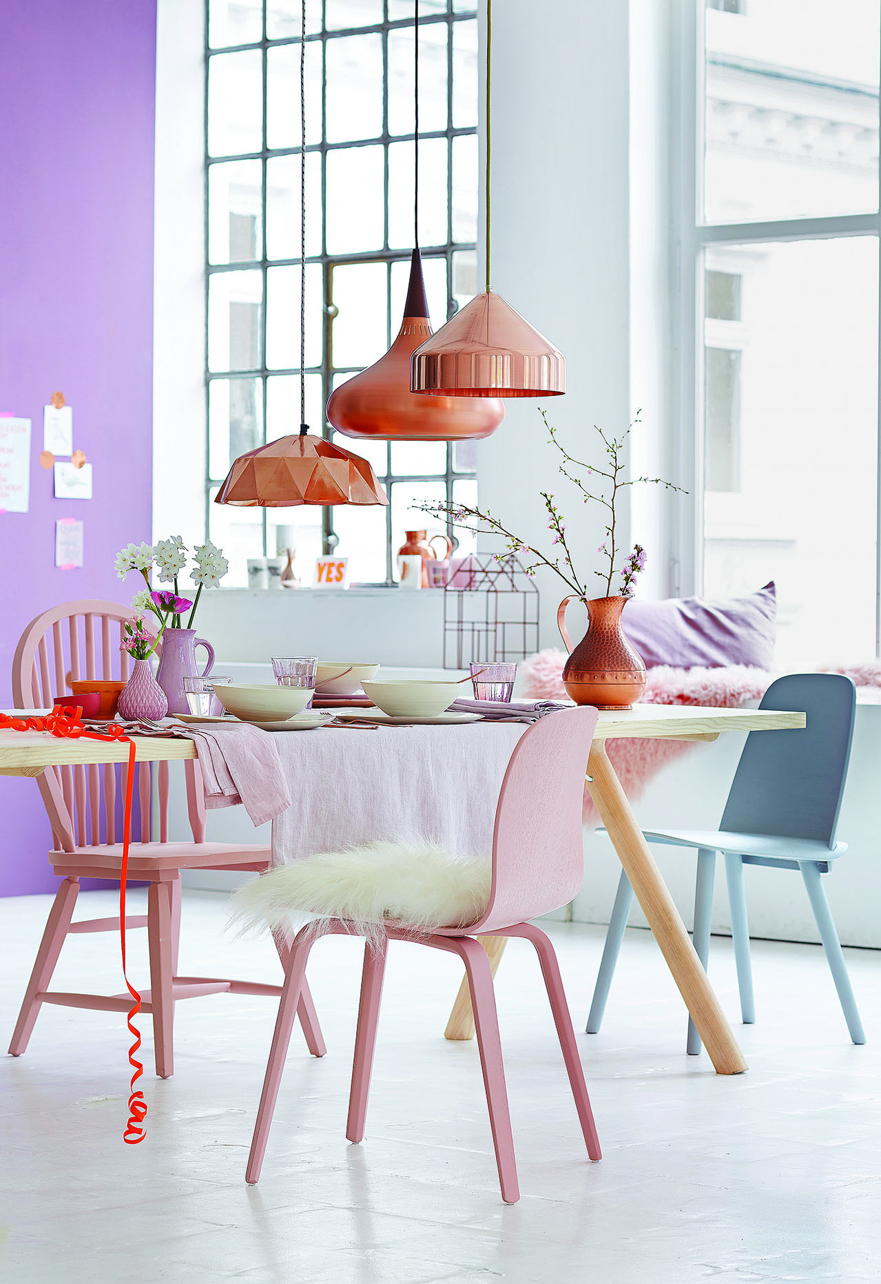 Te modne połączenia kolorów –pudrowy róż w parze ze szmaragdem lub miedzią – sprawią, że wnętrze będzie eleganckie i wesołe.