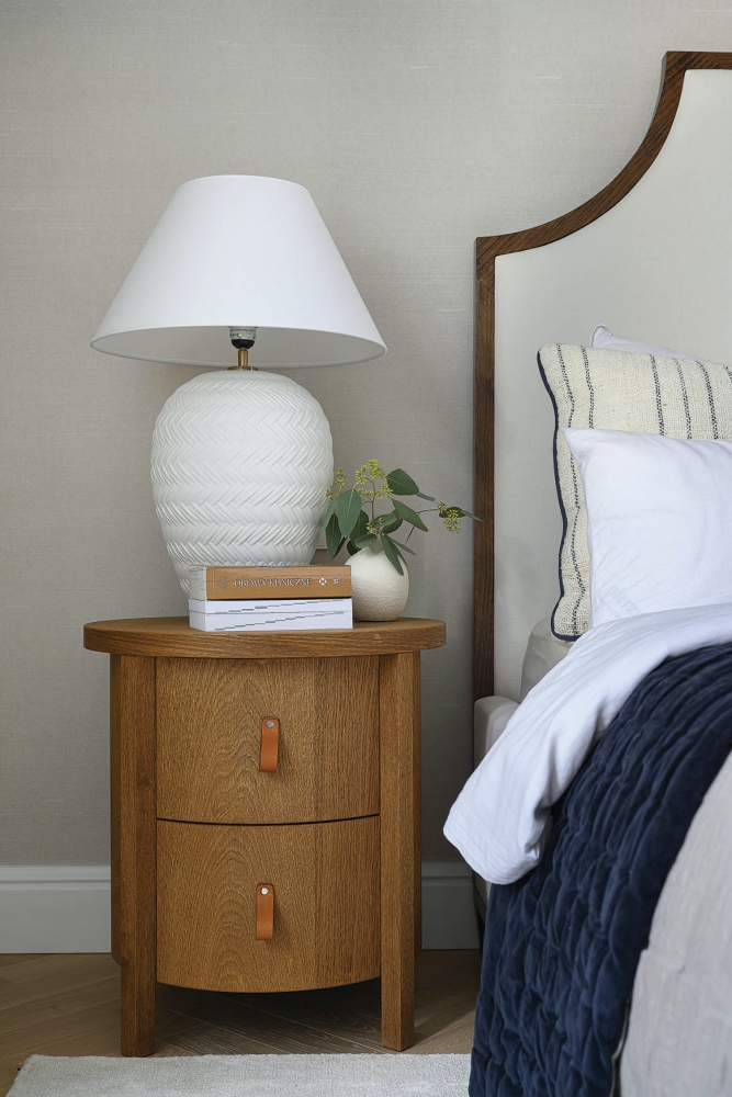 elegancka sypialnia beż i drewno