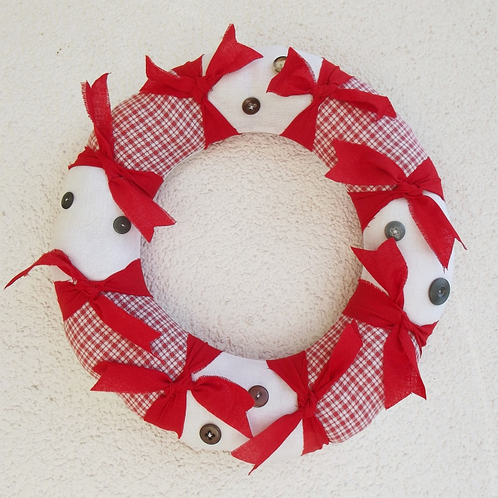 Uszyty z tkanin bawełnianych w tonacji biało-czerwonej, ozdobiony czerwonymi, nieobrębionymi kokardkami i guzikami. Wypchany solidnie (bez pustych przestrzeni) watą poliestrową. Małgorzata 'Shayneen' Nowak www.rusticnook.blogspot.com/www.rusticnook.decoart.pl
