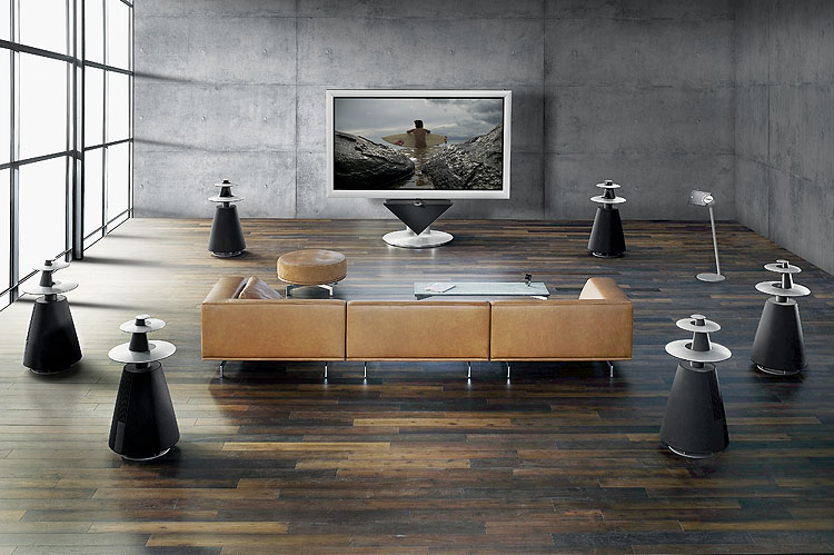 Telewizor BeoVision 4-103, 103 cale, 496 tys. zł; głośnik centralny (pod telewizorem) za 15 400 zł, pozostałe BeoLab 5 po 40 tys. zł, pilot 2900 zł, na stojaku (po prawej stronie) źródło muzyki z twardym dyskiem, radiem, możliwością podłączenia iPada i bezprzewodowego sterowania iPadem lub komputerem. Cena zestawu 25 tys. zł. BANG & OLUFSEN