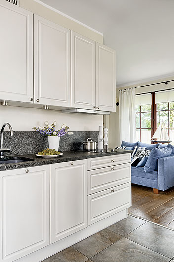 Dom nad jeziorem urządzony w stylu marynistycznym, w bielach i błękitach.
