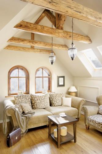 • Drewniane krokwie są piękną ozdobą wnętrza.