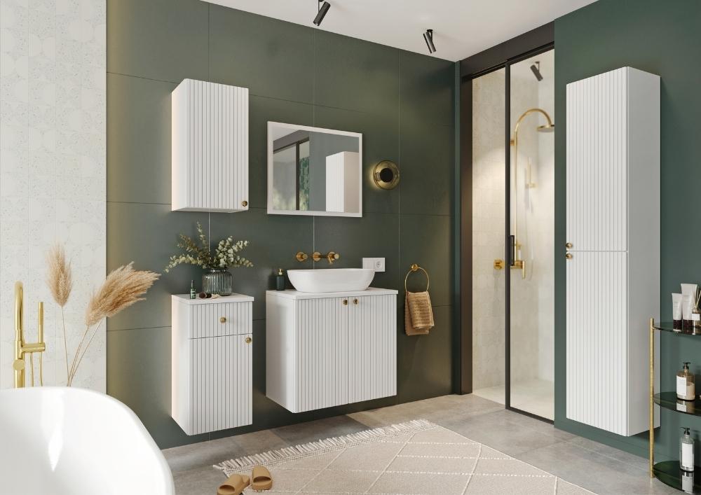 Jeśli łazienkowe meble z ryflowanymi frontami podwiesisz kilka centymetrów nad podłogą, całe wnętrze nabierze lekkości, stolkar.pl