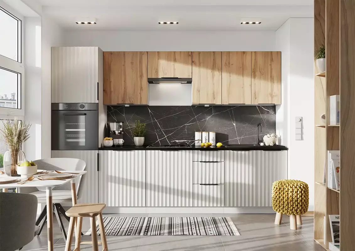Ryflowane fronty szafek kuchennych połącz z drewnianymi – zrobi się przytulnie i nowocześnie zarazem, stolkar.pl