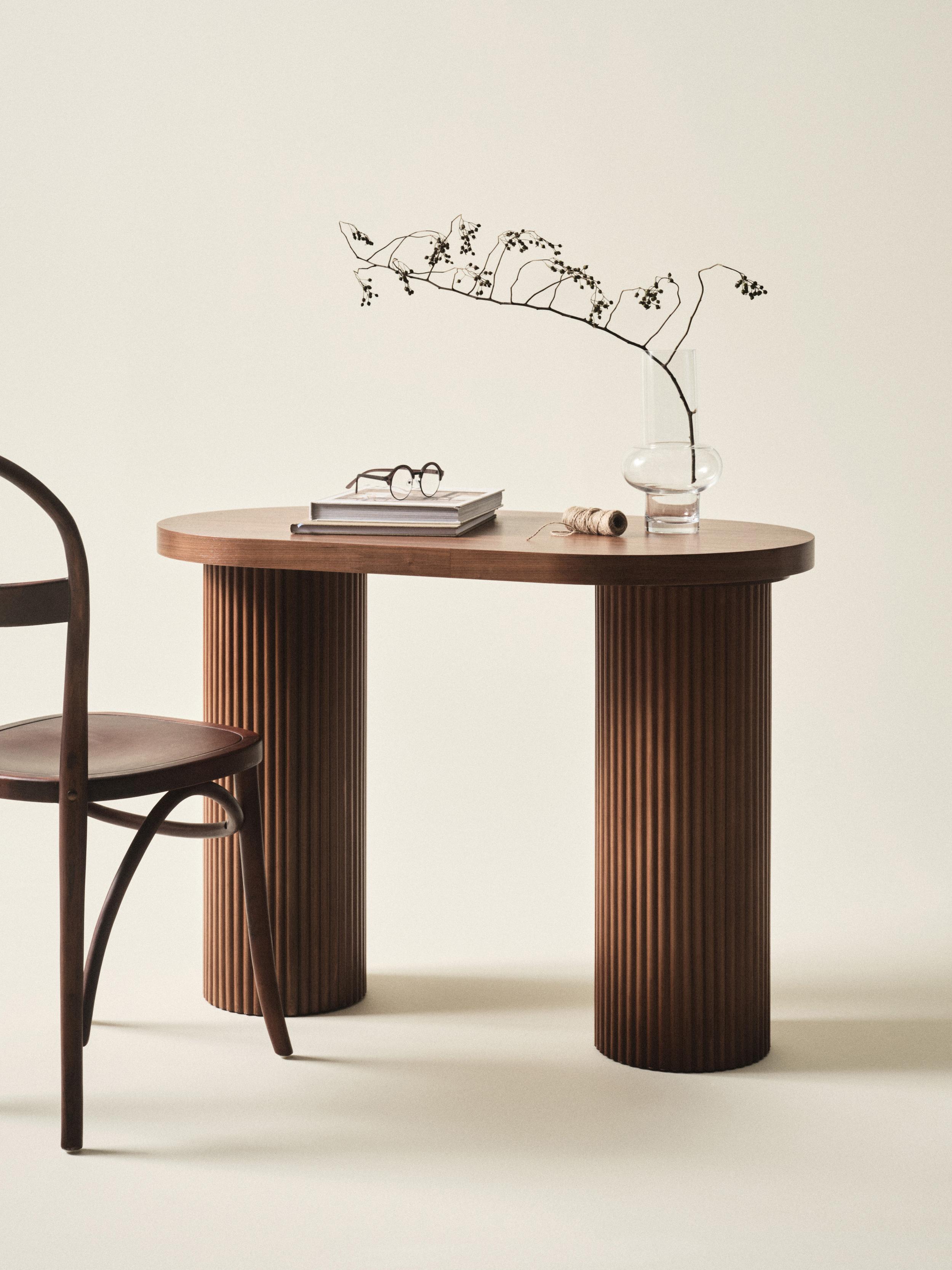 Taki lekki stolik na ryflowanych nogach może być biureczkiem w salonie, toaletką w sypialni lub konsolą w przedpokoju, jotex.pl