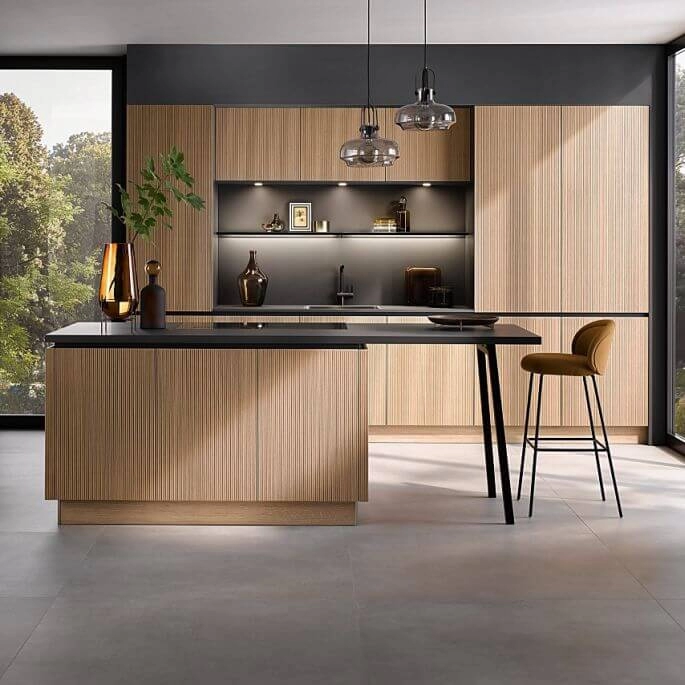 • ryflowane fronty mebli zestaw z lamelami na ścianie