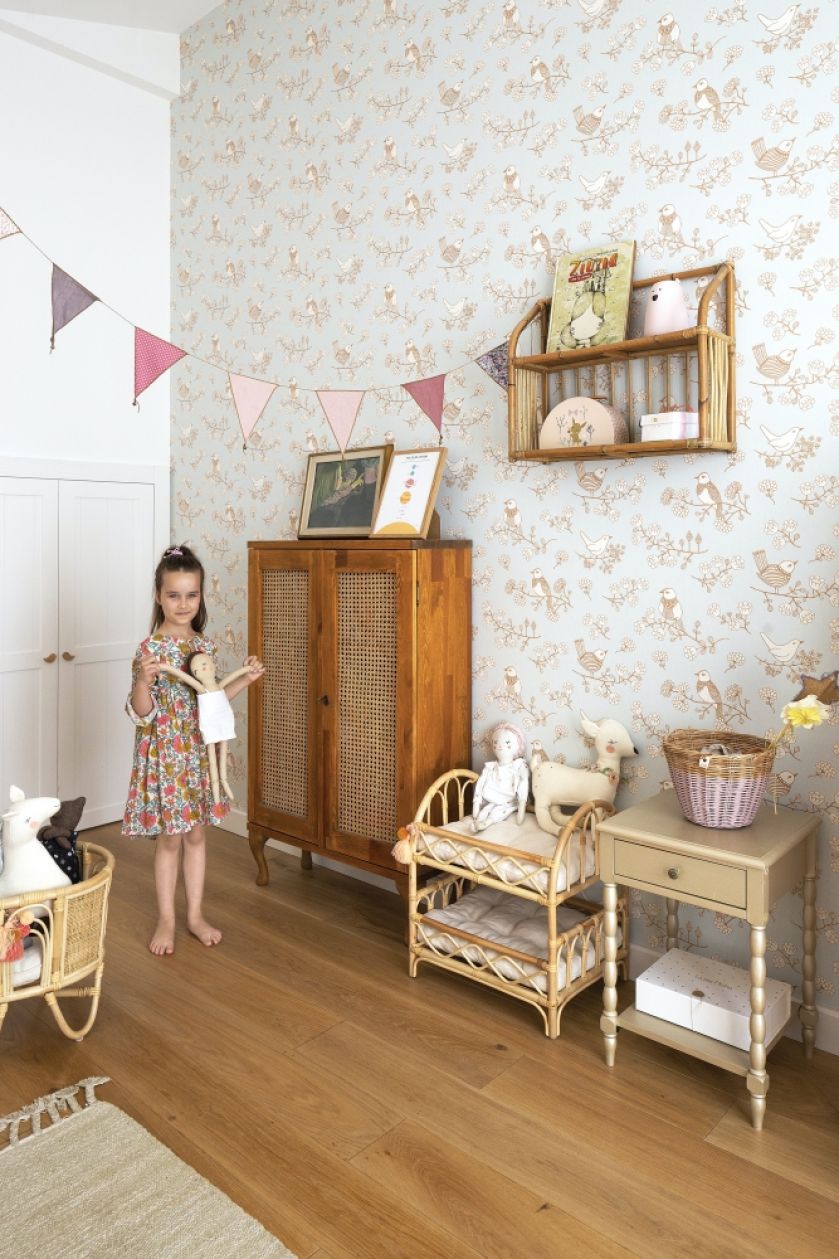 Tapety w pokojach dziewczynek to majvillan, bieliźniarka, złota komódka i łóżeczko u Nadii – wood szczęścia, gięta półeczka – meli melu, stolik i krzesełko w pokoju młodszej gai – Les Gambettes.