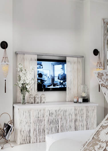 W salonie biały ekran z rafii, za którym ukrywa się telewizor.