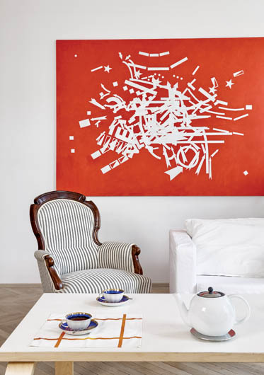 Akcenty kolorystyczne: obrazy pana domu, książki i kwiaty.