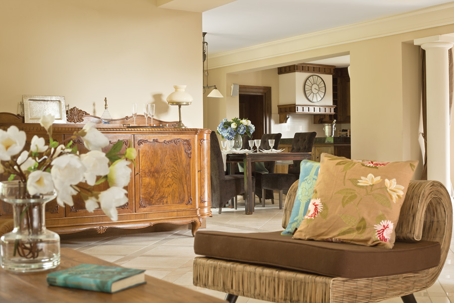 Beże i brązy, solidne dębowe meble i obraz z zabytkowym sportowym samochodem. Klasyka w najlepszym stylu.