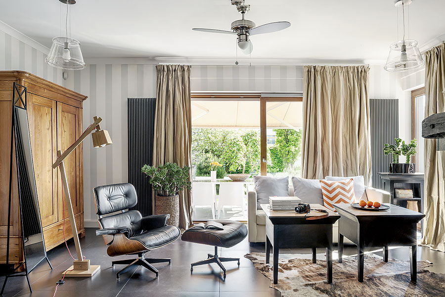 Królem w salonie jest Lounge Chair Eamesów, obok kultowego fotela stoi dizajnerska dębowa lampa z