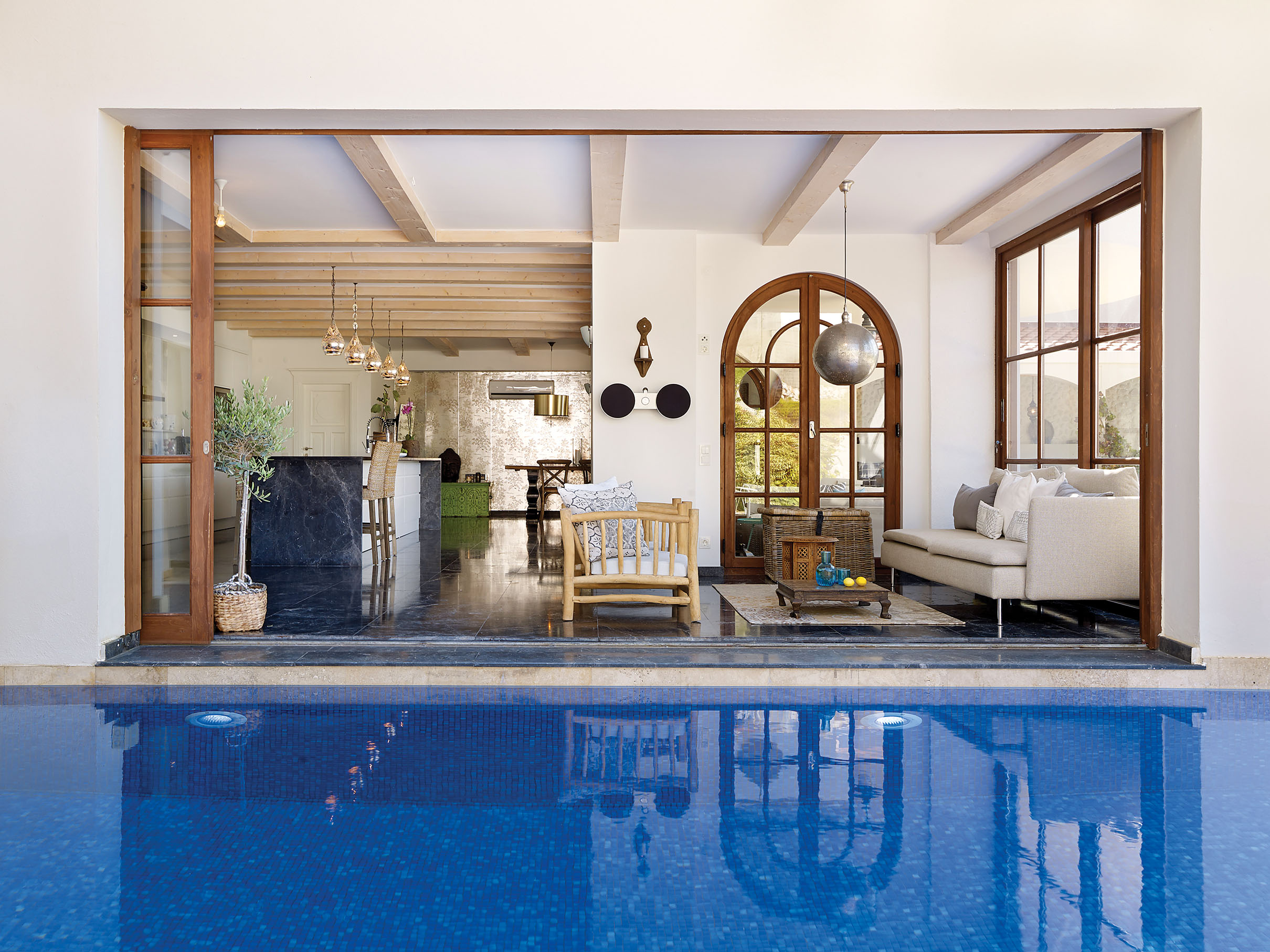 Większość drzwi na parterze rozsuwa się, tak jak te w jadalni. Wystarczą dwa kroki, by urządzić sjestę na basenie.