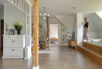 Jak urządzić mieszkanie na poddaszu? W tym 80-metrowym apartamencie architektka perfekcyjne wykorzystała skosy – dopasowała do nich bibliotekę oraz kuchenną zabudowę, a praktyczny podest z szufladami służy jako dodatkowe miejsce do przechowywania.