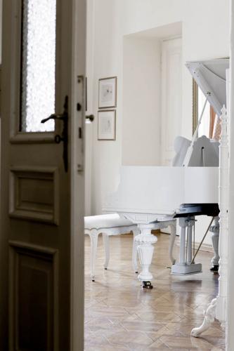 W salonie stoi biały fortepian. Klasyka z odrobiną Prowansji