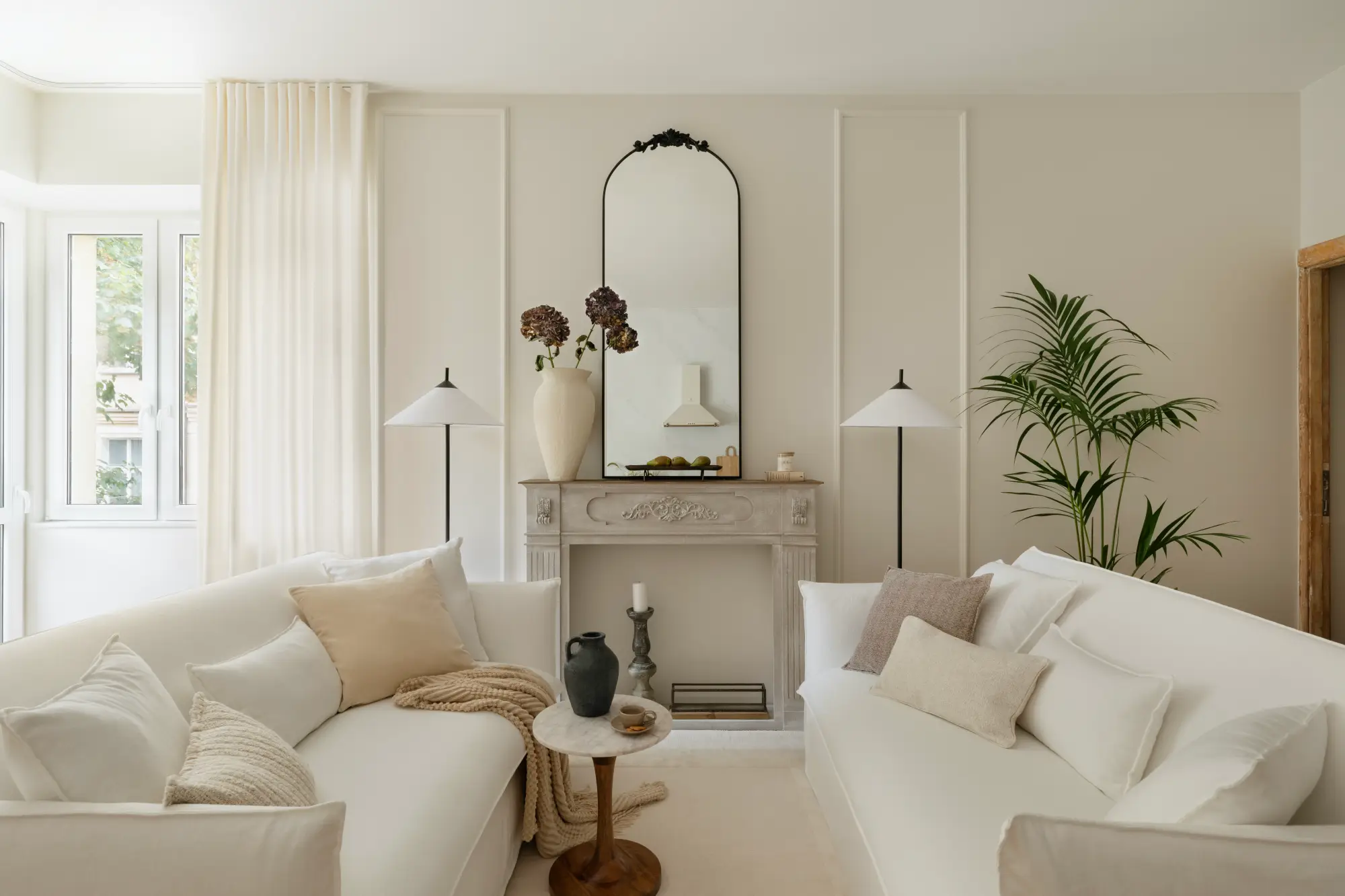 Kaszmirowe mieszkanie z bielą, akcentami beżu i tapetami w oprawie ze sztukaterii. To wnętrze koi zmysły!