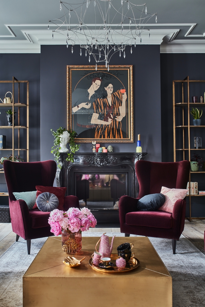 ciemne kolory i złoto w salonie