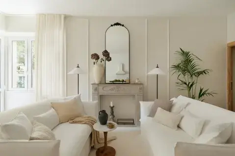 Kaszmirowe mieszkanie z bielą, akcentami beżu i tapetami w oprawie ze sztukaterii. To wnętrze koi zmysły!