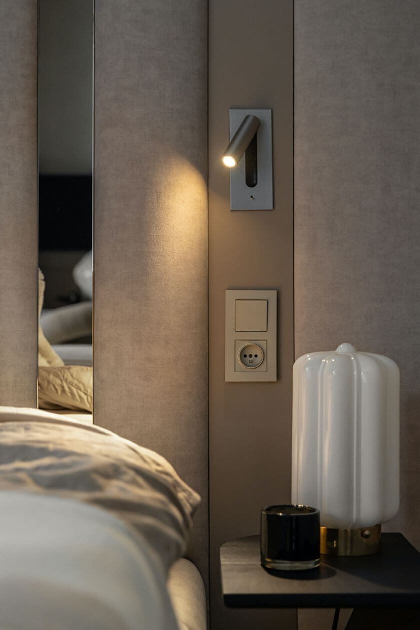 Eleganckie połączenie beżu i szarości otula łagodnie ten luksusowy nadmorski apartament. Stonowaną paletę przełamują odcienie błękitów, ożywają faktury tkanin i struktury materiałów wykończeniowych.