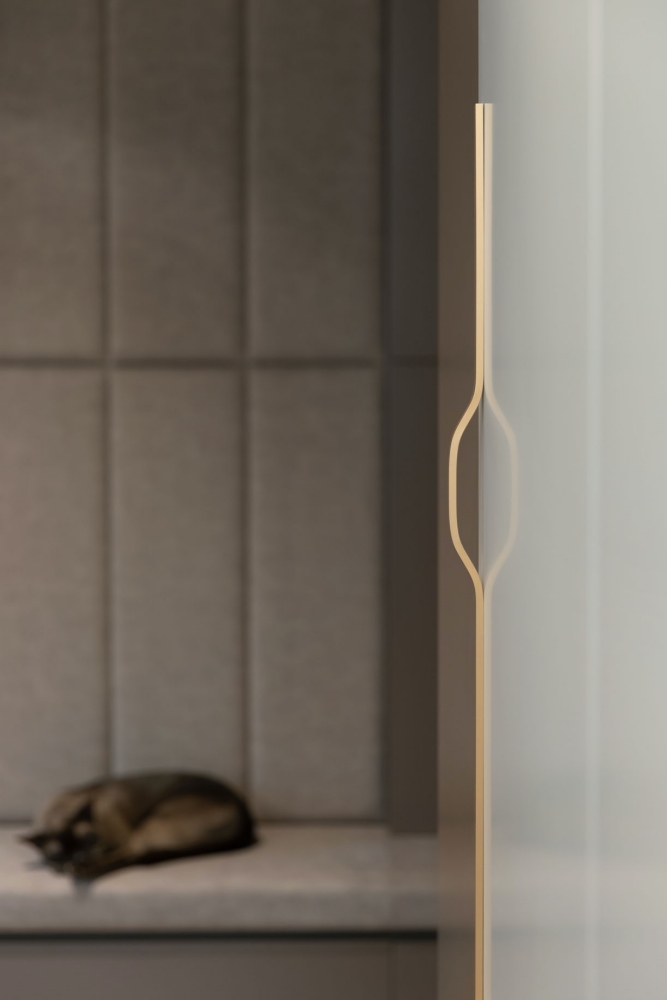 Eleganckie połączenie beżu i szarości otula łagodnie ten luksusowy nadmorski apartament. Stonowaną paletę przełamują odcienie błękitów, ożywają faktury tkanin i struktury materiałów wykończeniowych.