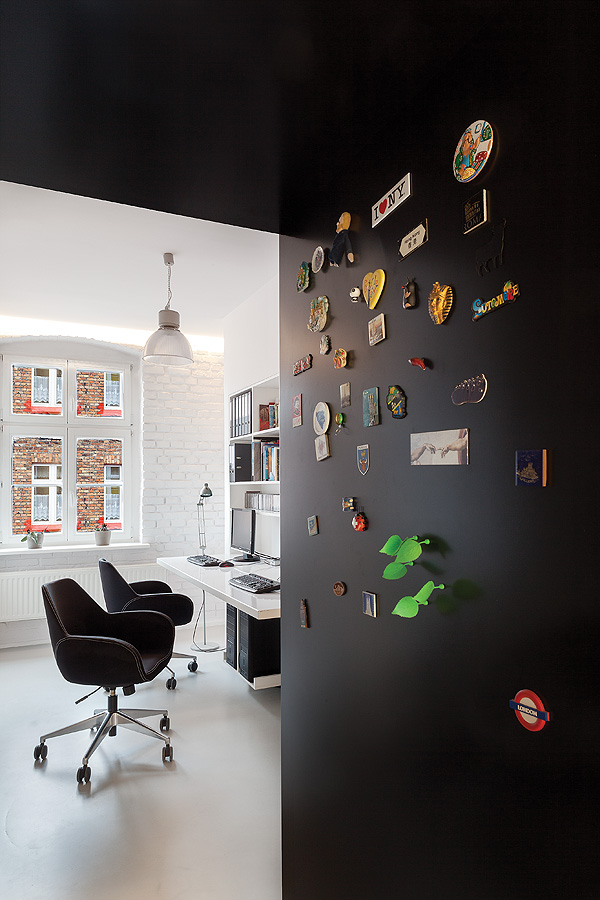 Salon od gabinetu oddziela wąska ścianka, a gabinet od części prywatnej (sypialni i łazienki) – przejście wyłożone czarną blachą, na której Magda i Piotrek wieszają przywożone z podróży magnesy i która ciekawie urozmaica jasne wnętrze.