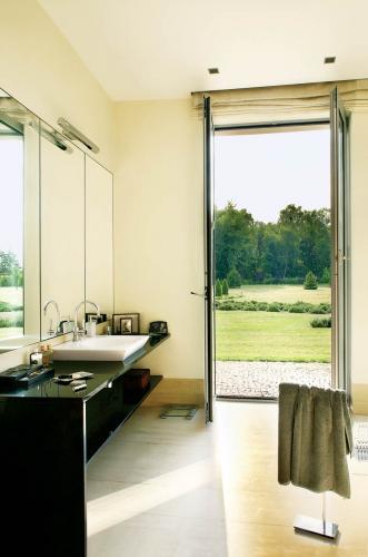 W tym domu można wyjść do ogrodu z każdego pokoju- także kąpielowego. Mocnym akcentem w łazience jest blat z marmuru Nero Zimbabwe.