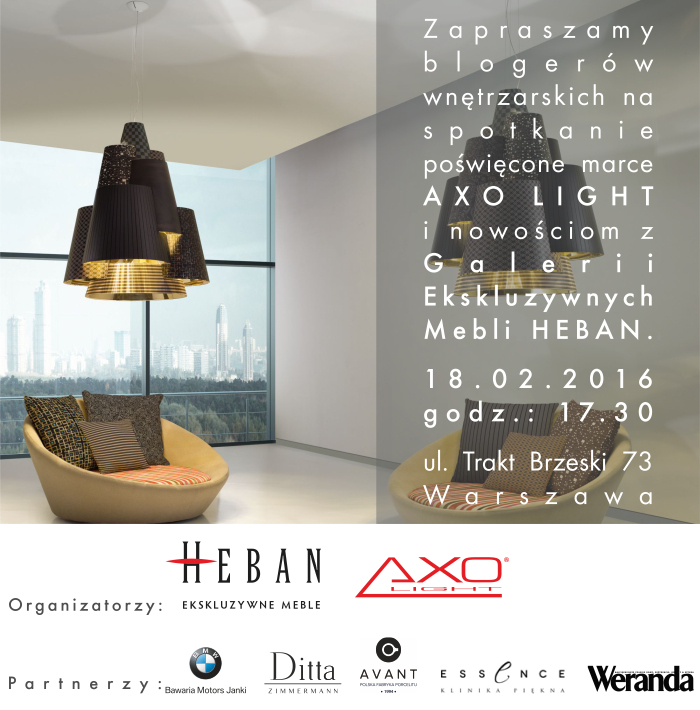 Miłośników designu, blogerów wnętrzarskich i dziennikarzy zapraszamy na spotkanie z marką Axo Light, które odbędzie się 18.02 br. o godzinie 17.30 w Galerii Ekskluzywnych Mebli HEBAN.