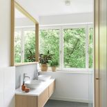 • biała łazienka z jasnym drewnem