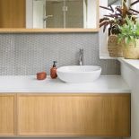 • szara łazienka z jasnym drewnem