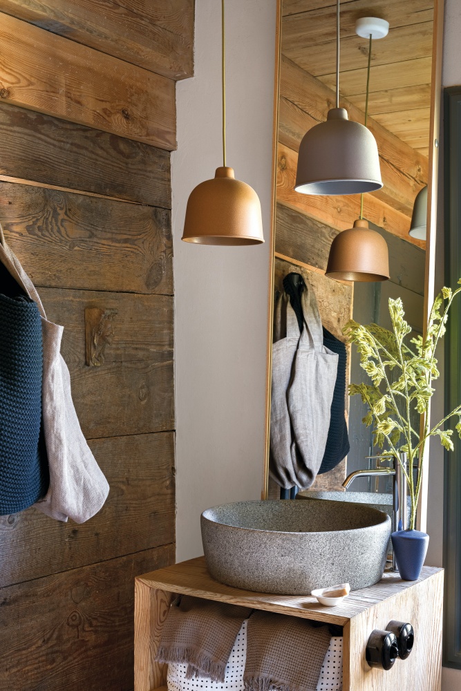 Właścicielka uwielbia łączyć współczesny minimalizm ze starymi elementami – prosta szafka-kostka to jej projekt, umywalka globo, nad nią skandynawskie lampy MuUto. Wszystko w kolorach ziemi i z naturalnych materiałów.
