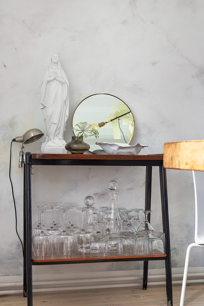 Stara konsola, dziś szafka na szkło, to pamiątka po babci Łukasza, tak jak stojąca na niej Maryjka.