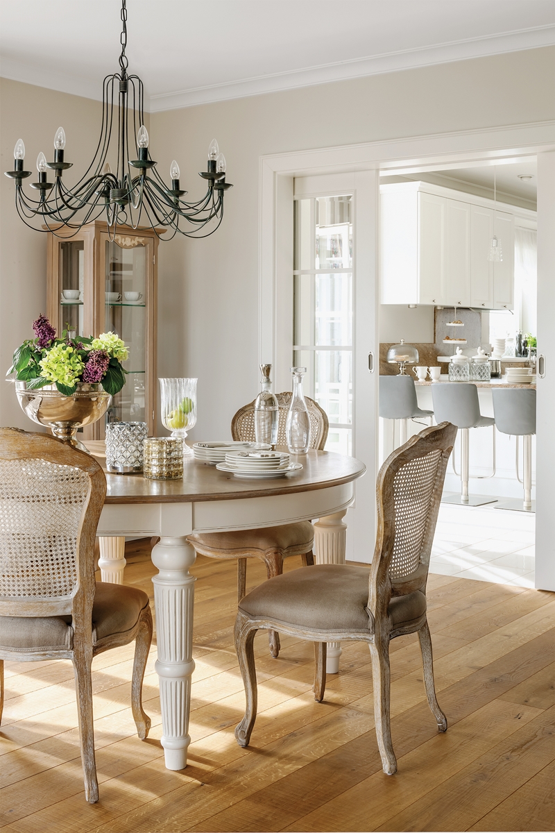 Do białego stylowego stołu z rzeźbionymi nogami pasują krzesła w stylu prowansalskim z charakterystycznymi plecionymi oparciami
