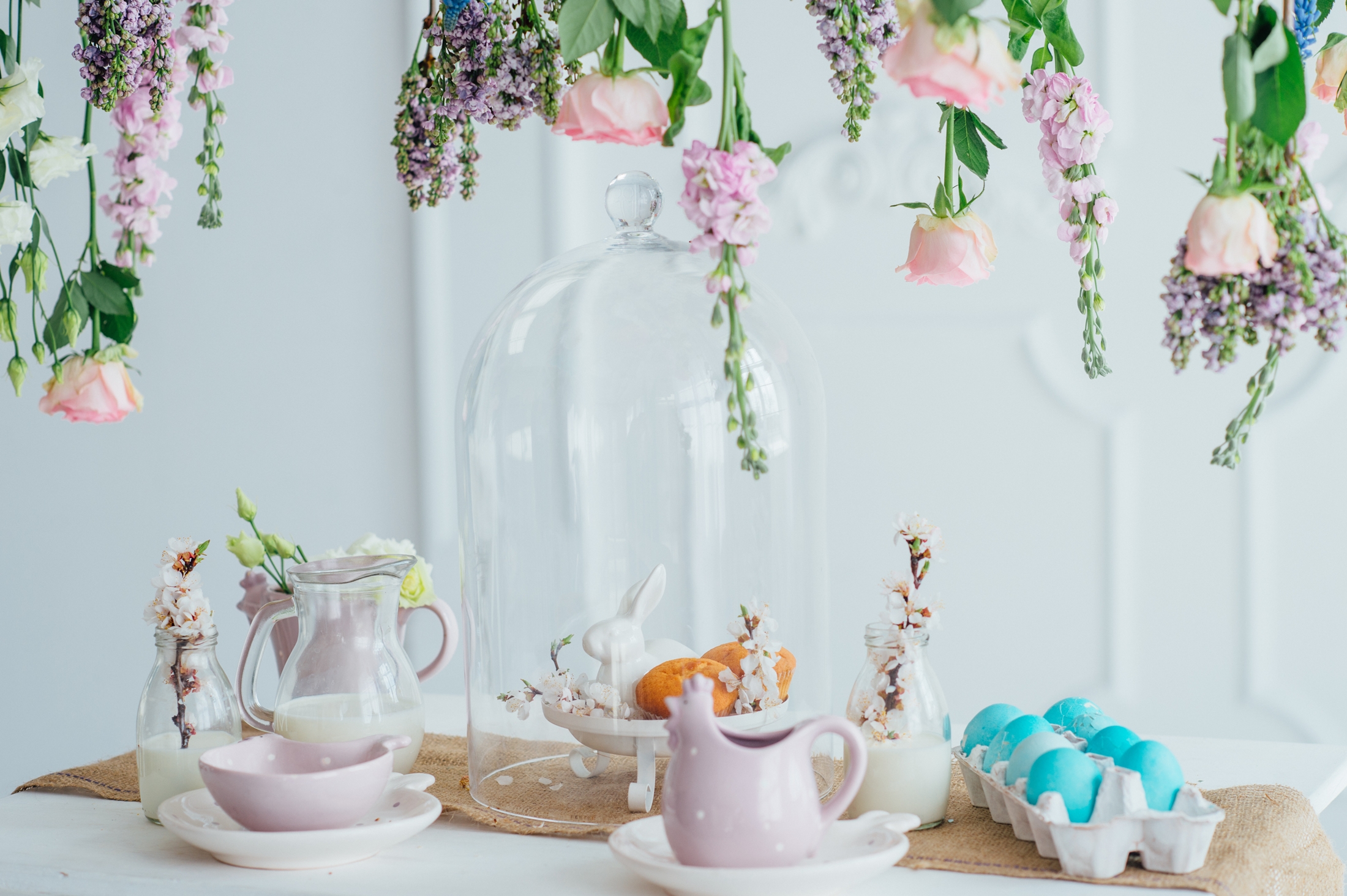 Pomysł na wiosenne i wielkanocne dekoracje - kwiaty nie tylko w wazonach, ale też zawieszone nad stołem
