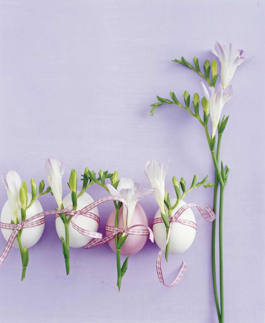 Pomysły na dekoracje z pisanek na stół – ozdobną tasiemką przywiąż do jajek łodyżki kwiatów lub świeże zioła.