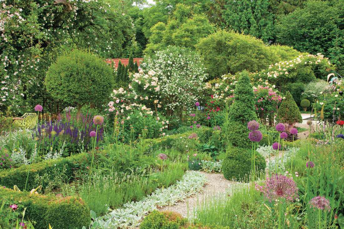 Topiary - ich geometryczne kształty wprowadzają do ogrodu trochę porządku. Świetnie wyglądają wśród krzaczków ziół i kulistych kwiatów czosnku.