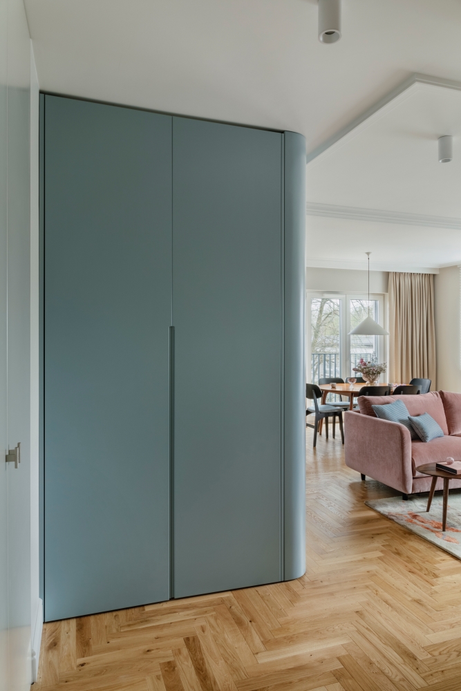 Błękit, pudrowy róż i modne obłości. To mieszkanie w pastelowych kolorach zaprojektowała pracownia Hanny Pietras