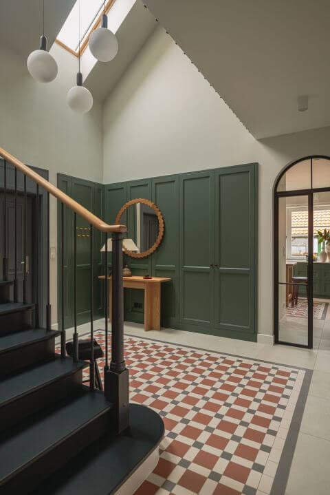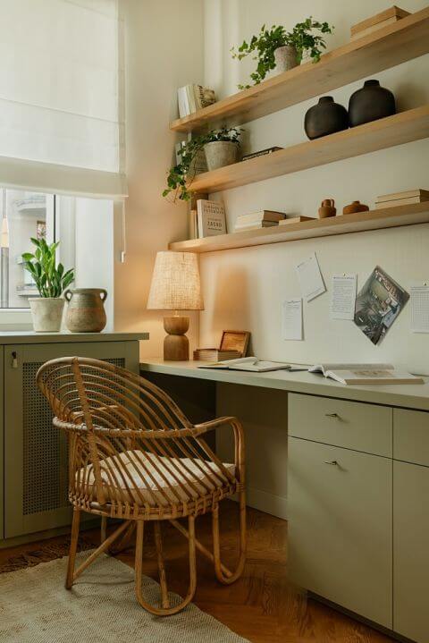 Aranżacja mieszkania 53 m2 – wnętrze w kolorze oliwkowej zieleni, z tapetą jak arras i wielofunkcyjnymi meblami