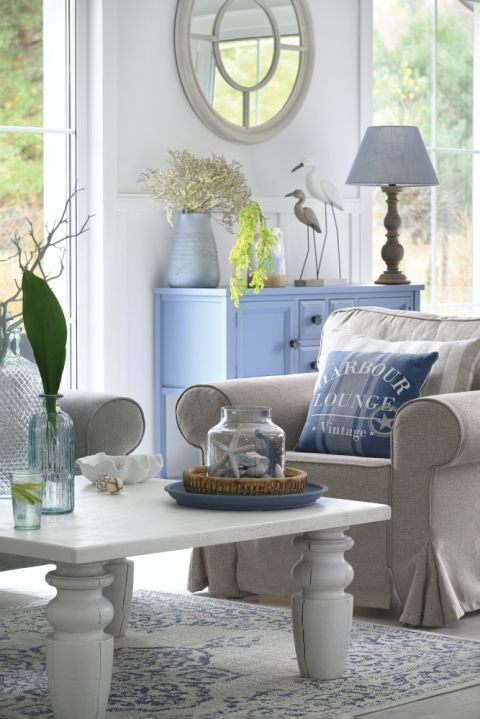 Letni dom w stylu hamptons nad Bałtykiem – wnętrza urządzone w marynistycznych kolorach: błękitach, bieli i szarości