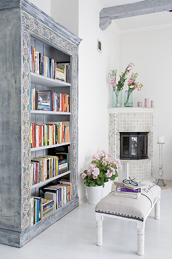 Właścicelka z projektantką przemalowały stare meble, belki pod sufitem, a nawet fugi w kominku.