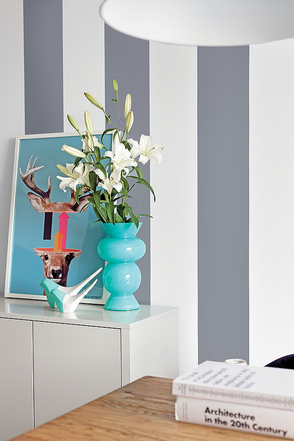 Ściana w malowane pasy. Obraz z jelonkiem i łanią na vespie, namalowany przez Lecha Batora.