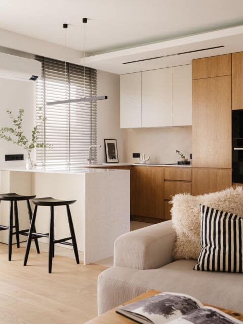 Przytulne mieszkanie w stylu japandi. Japońską prostotę ocieplają naturalne materiały