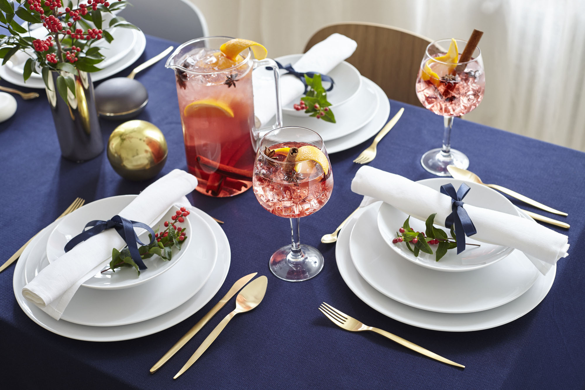 • Mocne zestawienie kolorów: granatowy obrus, złote, złote sztućce i czerwień świątecznych napojów.